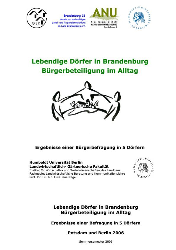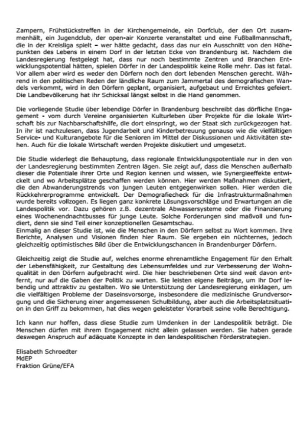 Nachdem ich in den letzten 1 1/2 Jahren immer wieder auf das gestörte politische Verhältnis zwischen Kernstadt Templin und den Ortstteilen gestossen bin, habe ich nach Alternativen gesucht und bin über ein Buch von Prof. Dr. Gerhard Henkel "Das Dorf, Landleben in Deutschland - Gestern und Heute" auf die Resulotion von Bleiwäsche 16, Ergebnisse des 16. Essener Dorfsympositums des Arbeitskreises Dorfentwicklung, auf die Internet-Plattform "Brandenburgisches Netzwerk für Lebendige Dörfer" aufmerksam geworden. Alle diese Veröffentlichungen und Internetauftritte wehren sich gegen die immer noch vorherrschenden Meinung, dass die Dörfer in Deutschland am Aussterben sind und keine Zukunft mehr haben. Leider basiert auch die kommunale Entwicklungspolitik in Brandenburg auf dieser falschen Annahme, die zu Fehlentwicklungen führt und das Wohl der Menschen in Brandenburg missachtet.