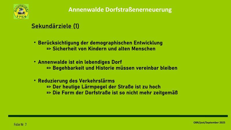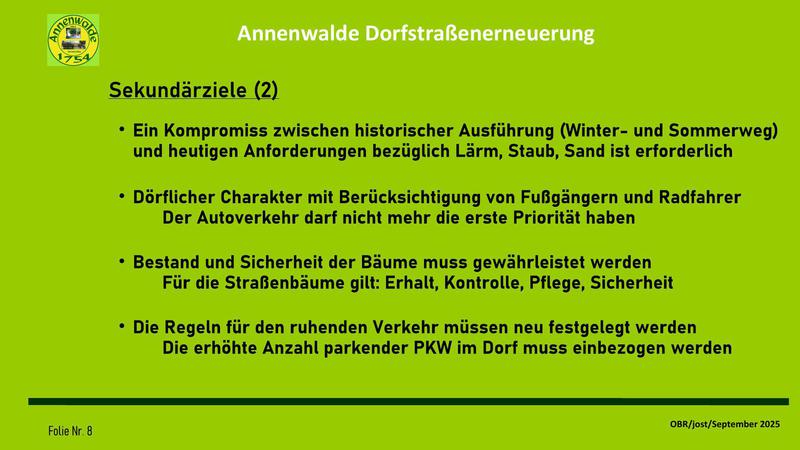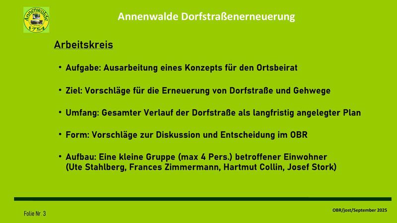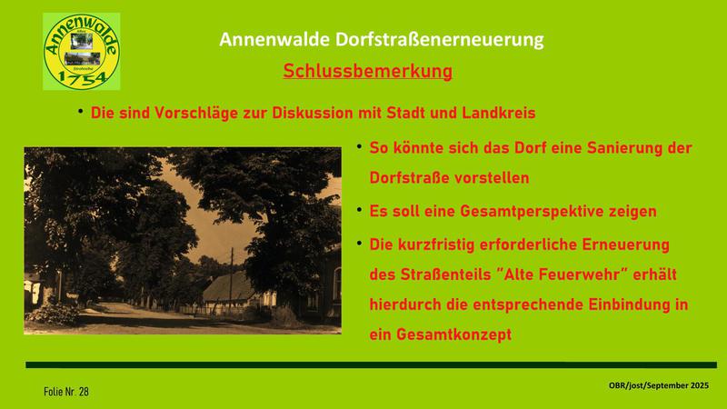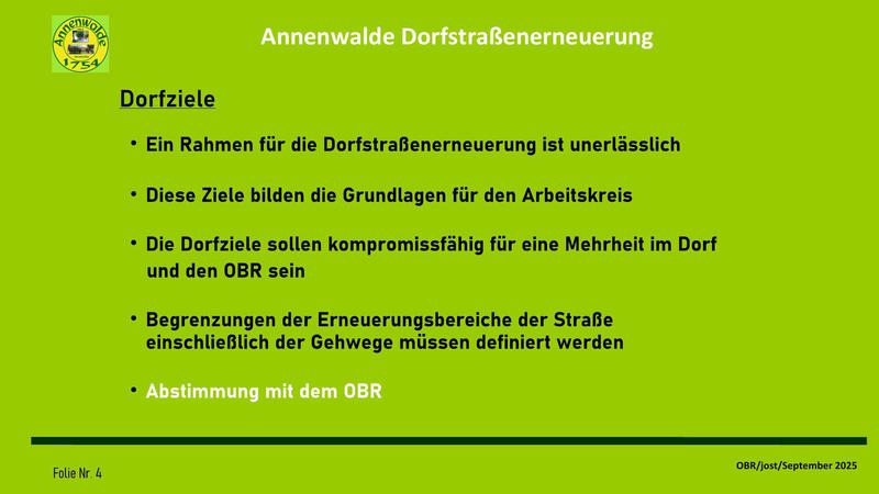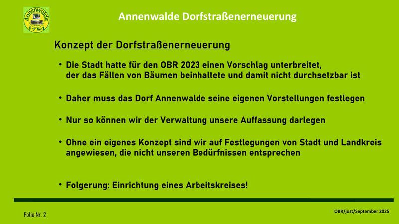 In der Sitzung wurde eine Präsentation über die Ergebnisse des Arbeitskreises zur Erneuerung der Dorfstraße vorgestellt. Diese Zusammenfassung stellt den aktuellen Stand der Wünsche und Forderungen des OBR zu einer langfristigen Planung dar. Sie ist, wie unser Ortsvorsteher anmerkte, keines Wegs "in Stein gemeißelt", sondern bedarf nun einer Aussprache im Dorf. Erst wenn eine deutliche Mehrheit im Dorf sich in dieser Vorstellung wiederfinden kann, kann sie zu einer Grundlage der Verhandlungen mit Stadt und Landkreis genutzt werden. Mit unserer Arbeit soll vermieden werden, dass eine Sanierungsplanung für die Dorfstraße an der alten Feuerwehr beschlossen wird und erst dann eine Diskussion im Dorf startet. Des weiteren wollen wir erreichen, eine gemeinsame Vorstellung festzulegen, wie unser Dorf langfristig aussehen soll, damit auch in Zukunft das Dorf für weitere Entwicklungen eine akzeptierte Basis besitzt.