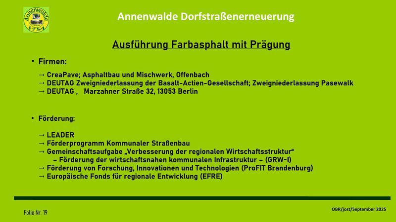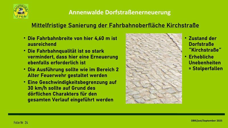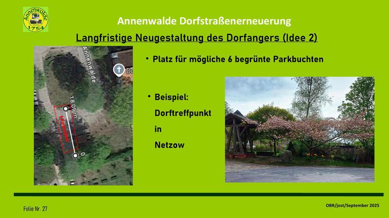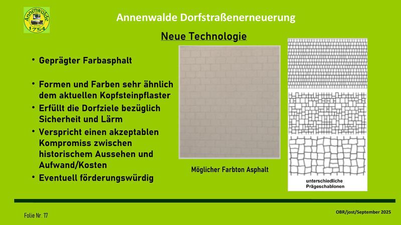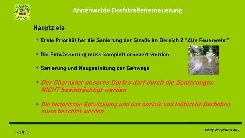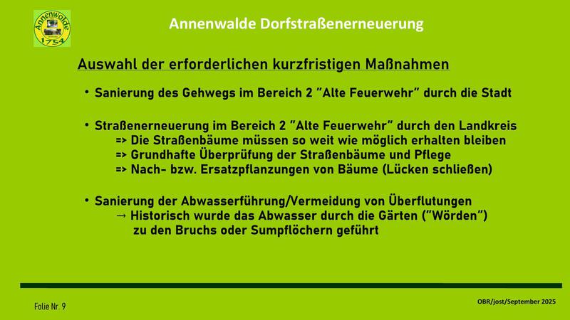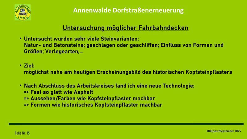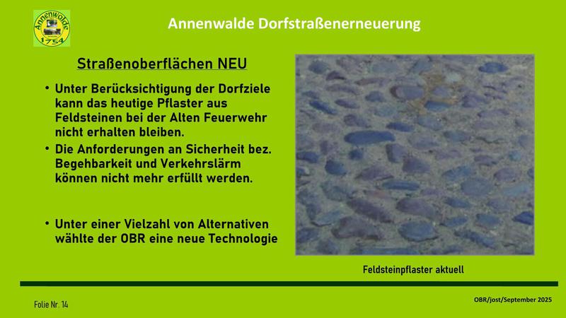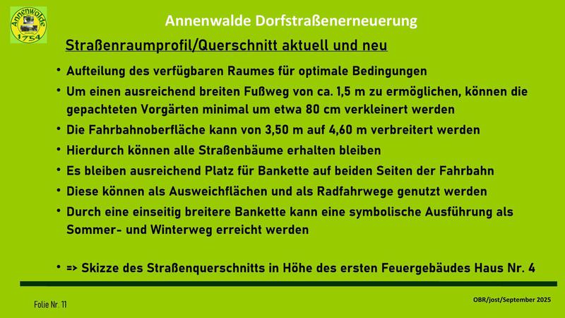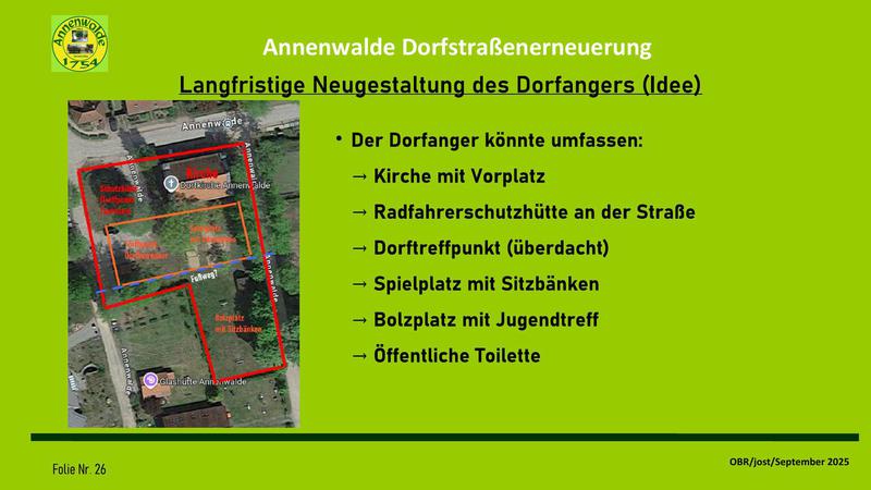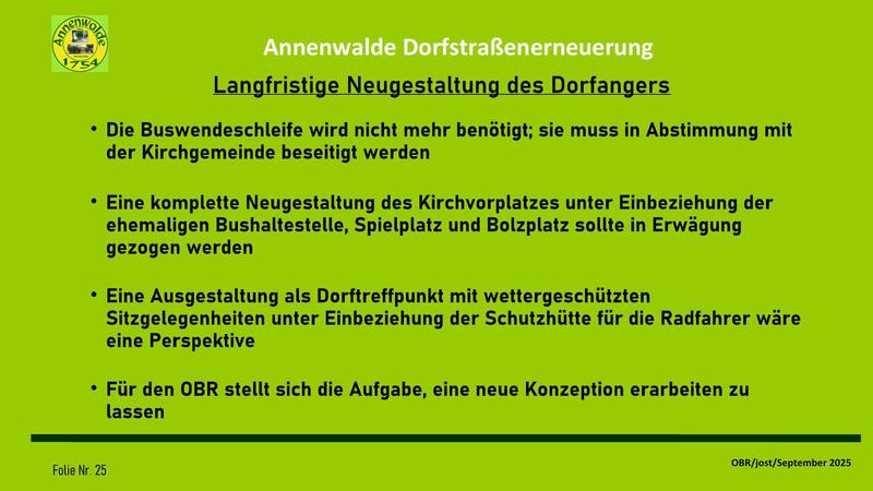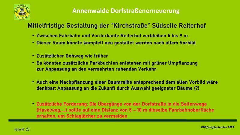 Auf meine Vorhaltung, wann die Dorfgemeinschaft in die Entwicklung der Dorfstraßenerneuerung eingebunden werden soll, hieß es, diese Einbindung sei ja durch die Gespräche mit dem OBR über die
