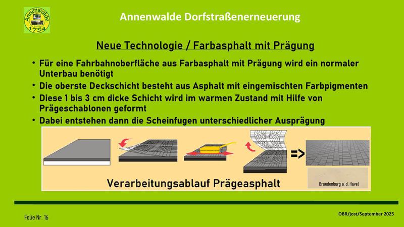Über die Gestaltung der Straßenoberfläche erwähnte BM Tappert, dass es sich nicht um Asphalt, sondern um (Natur-)Steine mit glatter Oberfläche handeln soll.