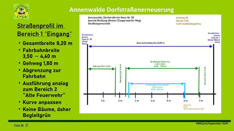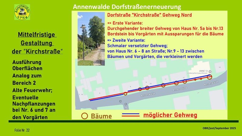 Fortsetzung des Fußweges im Hauptteil der Dorfstraße an der nördliche Seite vor den Häusern 6 bis 13 (Schilling bis Kleine Schorfheide) liegen soll.